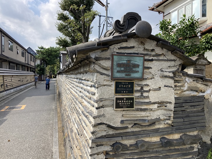 見所ポイントDの「築地塀」は、平成四年(1992年)に台東区の「まちかど賞」に選ばれ、寺町谷中のシンボルのひとつとして映画やドラマのロケ地に選定されたり、雑誌にも多く紹介され、谷中・根津・千駄木の谷根千地域の散策に訪れる多くの人達に親しまれています。築地塀(ついじべい)とはいわゆる土塀のことで、単に築地とも言います。主に、石垣を台座として塀の中心となる部分に木の柱を立て、柱を中心に木枠を組み、そこに練り土(粘土質の土に油や藁などを混ぜた土)を入れて棒で突き固める版築工法で造られたものを呼びます。塀の上部には雨除けに瓦屋根が葺かれ、表面も漆喰で仕上げられています。古くは土のみで作られていましたが、強度を増す・雨水から守る・染み込む雨水の水はけを良くするために、瓦を間に入れて造られるものも登場しました。その場合も、表面に瓦が見えないように全体的に漆喰で仕上げるものと、あえて瓦を見えるように瓦と瓦の間を漆喰で仕上げるものなど様々です。築地は、もとは築泥と呼ばれていたとされています。字のごとく泥を積み上げて造ることからそのように呼ばれていました。観音寺の築地塀は幕末の頃に築かれたもので、当寺は観音寺の境内の東面と南面を囲っていましたが、現在では南面のみ残っています。大正十三年(1923年)に起こった関東大震災により一部倒壊しましたが、第一次世界大戦終戦から始まった戦後恐慌によって物資が乏しかったために、できるだけ元の資材を使用して倒壊箇所が組み直されました。その後、経年による細かな損傷は見られましたが、補修を重ねて江戸時代往時の姿を今日に残しています。江戸時代から続く有数の寺町である谷中の当時の面影を伝え、歴史的景観に寄与するということから、平成十二年(2000年)に国指定の有形文化財に登録されました。