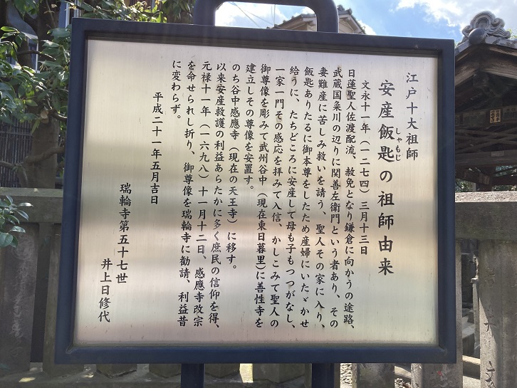 日蓮が鎌倉と安房を往復する際に関小次郎長耀の屋敷に宿泊し、関小次郎が日蓮に帰依して草庵を結んだのが天王寺の始まりです。天王寺は、日蓮の弟子の日源が法華曼荼羅を勧請して開山しました。寛永十八年(1641年)に徳川家光・英勝院・春日局の外護を受け、3万坪の土地を拝領し、将軍家の祈祷所となりました。元禄十三年(1700年)に幕府公認の富突(富くじ)が興行され、目黒不動・湯島天神と共に、天王寺は「江戸の三富」として大いに賑わいました。享保十三年(1728年)に幕府から富突禁止令が出されましたが興行は許可され続け、天保十三年(1842年)に禁令が出されるまで続けられました。