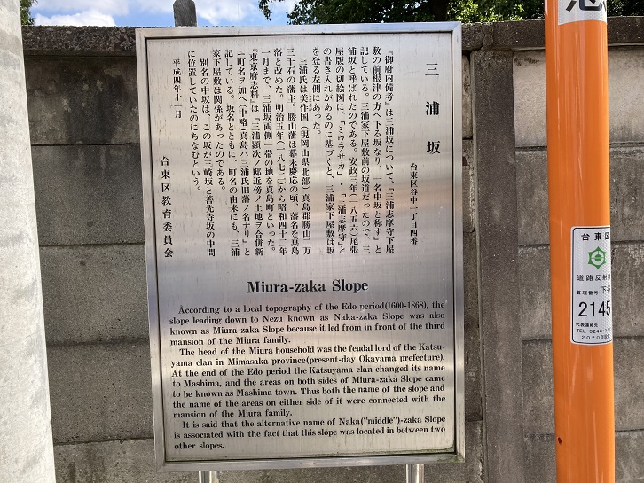 歩道脇に旧町名の由来を記した案内板が立っています。谷中には坂が多いので、そのまんまの町名になっていますね。
