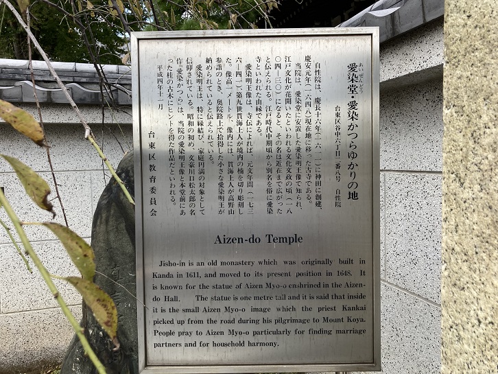 Jisho-in is an old monastery which was originally built in Kanda in 1611, and moved to its present position in 1648. It is known for the statue of Aizen Myo-o enshrined in the Aizen-do Hall. The statue is one metre tall and it is said that inside it is the small Aizen Myo-o image which the priest Kankai picked up from the road during his pilgrimage to Mount Koya. People pray to Aizen Myo-o particularly for finding marriage