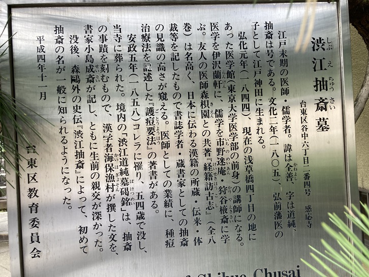 江戸末期の医師・儒学者。諱は全善、字は道純、抽斎は号である。文化二年(1805年)、弘前藩医の子として江戸神田に生まれる。弘化元年(1844年)、現在の浅草橋四丁目の地にあった医学館(東京大学医学部の前身)の講師になる。医学を伊沢蘭軒に、儒学を市野迷庵・狩谷(エキ)斎に学ぶ。友人の医師森枳園との共著「経籍訪古志」(全八巻)は名高く、日本に伝わる漢籍の所蔵・伝来・体裁等を記したもので書誌学者・蔵書家としての抽斎の見識の高さが窺える。医師としての業績に、種痘治療法を記述した「護痘要法」の著書がある。安政五年(1858年)コレラに罹り、五四歳で没し、当寺に葬られた。境内の「渋江道純墓碣銘」は、抽斎の事蹟を刻むもので、漢学者海保漁村が撰した文を、書家小島成斎が記し、ともに生前の親交が深かった。没後、森鴎外の史伝「渋江抽斎」によって、初めて抽斎の名が一般に知られるようになった。