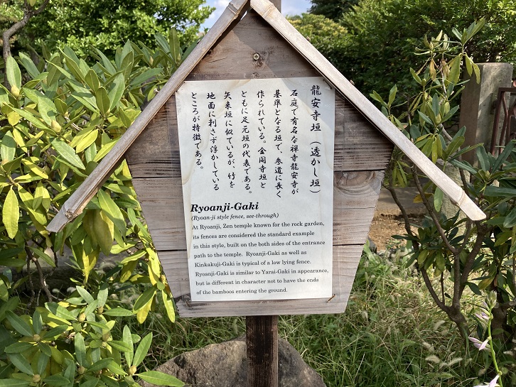 At Ryoanji, Zen temple known for the rock garden, its fences are considered the standard example in this style, built on the both sides of the entrance path to the temple. Ryoanji-Gaki as well as Kinkakuji-Gaki is typical of a low lying fence.