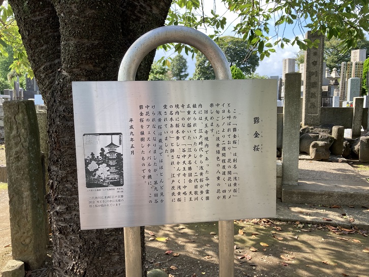 染井霊園にはソメイヨシノの木が多く植えられていますが、谷中霊園には鬱金桜の木が多いようです。鬱金桜は江戸中期以前に人の手によって作られた品種と考えられ、花弁が香辛料で知られるウコン(鬱金)に似た萌黄色になることからウコンザクラと名付けられました。黄色い花を咲かせる唯一のサクラであり、清酒「黄桜」はこの花に因んでいます。
