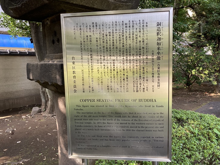 This figure was created in 1690 by Ota Kyuemon, who lived in Kanda Nabecho. The inscription on the base of the figure tells that it was first set up to the right of the old main temple. This would now be about in the centre of the present west side road to the north of the remains of the five-storied pagoda of Ten-noji temple. In 1874 the figure was moved to the western corner to open Yanaka cemetery. In June of 1933 it was repaired, moved to the present site and placed on a newly built ferroconcrete base. In 1938 the charnel house was built in the base. In The Edo and Meiji eras the figure was repeatedly reported in various documents and books and has been very popular among people as "Ten-noji Daibutsu". It was registered as a tangible cultural asset in 1993 in the Book of Cultural Assets of Taito City.
