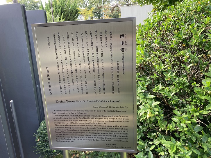 built extensively in the Edo period and later. According to the Koshin faith, believers can obtain longevity and sound health by staying up all night without sleep on the day of Koshin, which happens every 60 days. Koshin groups were organized for each region, and events were held for group members to gather on those evenings. There are 61 Koshin towers that still exist in Taito City. There are ten Koshin towers in Tenno-ji Temple. One of them is placed inside a miniature structure for worship situated in front of the temple. These Koshin towers were built from 1663 to 1715. Towers bearing the name of Koshin group members include mention of Yanaka Village Group, suggesting that the Koshin group was organized by local residents. As such, because these towers are a valuable resource that reveals the faith of the people