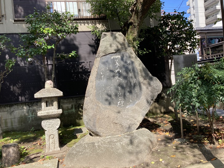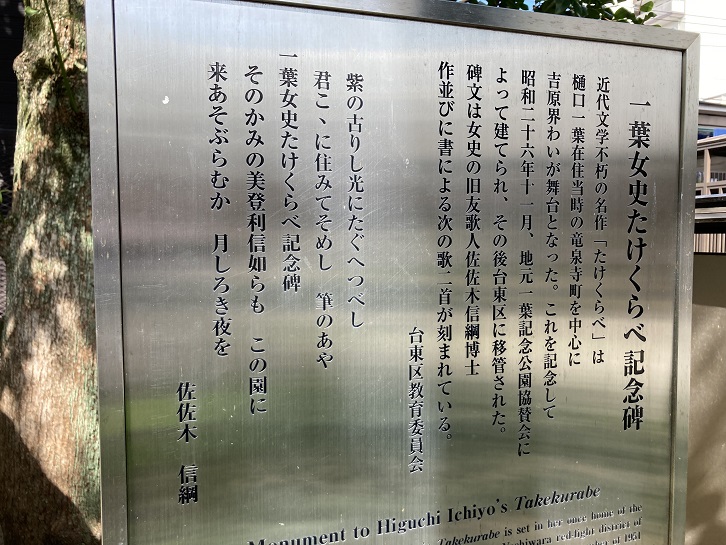 一葉博物館の真向かいにある一葉記念公園の敷地内には、樋口一葉の代表作である「たけくらべ」の記念碑が建っています。近代文学不朽の名作「たけくらべ」は、樋口一葉が住んでいた当時の竜泉寺町を中心に、吉原界隈が舞台となりました。これを記念して、昭和二十六年11月、地元の一葉記念公園協賛会によって石碑が建てられ、その後台東区に移管されました。碑文は一葉の旧友である歌人の佐佐木信綱作並びに書による二首が刻まれています。あまりに達筆すぎて私には読めませんが、石碑の隣には台東区が設置した案内板が立っていて、碑文について解説してあります。