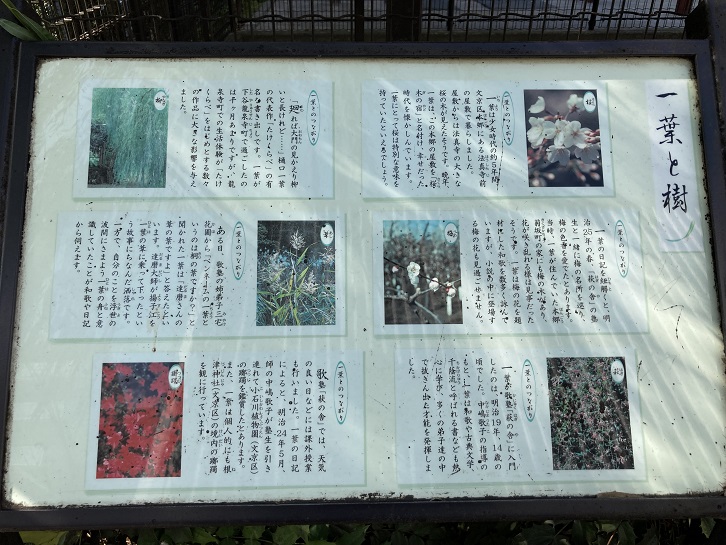 公園には、一葉桜や一葉に因んだ植物が植栽されています。「一葉と樹」と題した案内板があります。