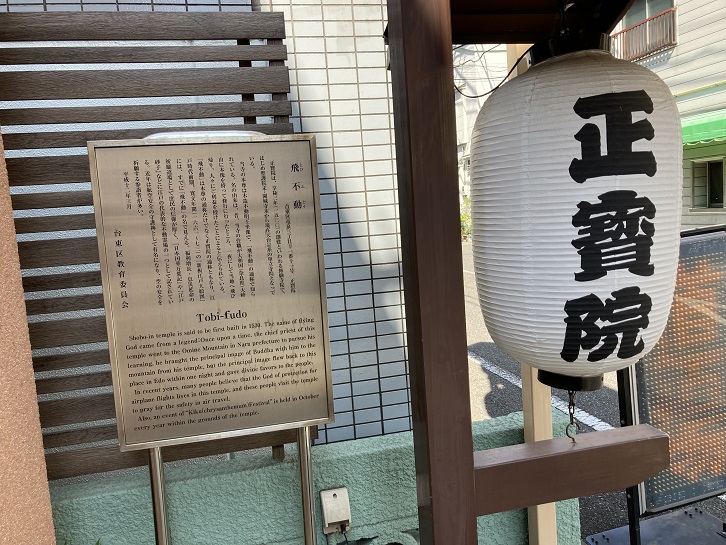 正寶院は、享禄三年(1530年)の創建といわれる修験寺院で、はじめ聖護院末・園城寺末から現在天台宗系の単立寺院となっている。当寺の本尊は木造不動明王坐像で、「飛不動」の通称で知られている。名の由来は、昔、当寺の住職が大和国(奈良県)大峰山に本像を持って修行に行ったところ、一夜にして当地へ飛び帰り、人々にご利益を授けたことによると伝えられている。「飛不動」は本尊の通称だけでなく正寶院の通称ともなり、江戸時代前期、寛文年間(1661年〜1673年)の「新板江戸大絵図」には、すでに「飛不動」の名で見える。福利増長・息災延命の祈願道場として庶民の信仰が厚く、「日本国華万葉記」や「江戸砂子」などに江戸の代表的な不動霊場の一つとして記されている。近年は航空安全の守護神として有名になり、空の安全を祈願する参詣者が多い。