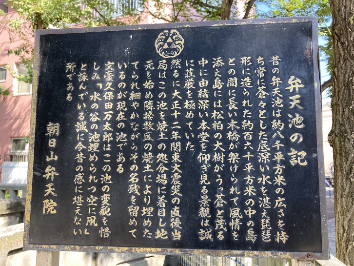 昔の弁天池は約八千平方米の広さを持ち、常に蒼々とした底深い水を湛え、琵琶形に造られた約百六十平方米の中の鳥との間に長い木橋が架けられて風情を添え、島には松柏の大樹がうっ蒼と茂る中に由緒深い本堂を仰ぎ見る景観は誠に荘厳を極めていた。然るに大正十二年、関東大震災の直後、当局はこの池を焼土の処分場に着目し、地元を始め隣接数区の焼土により埋めたてられ、細やかながらその名残を留めているのが現在の池である。文豪久保田万太郎はこの池の変貌を惜しみ、「水の谷の池埋められつ空に凧」と詠んでいる。誠に今昔の感に堪えない所である。