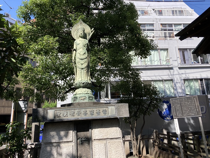 弁天池に嵌まって亡くなった人や、焼土の埋め立てにより生き埋めになった魚類、更には焼土を運搬している途中で死んだ馬などを供養するために観音菩薩が建立されました。