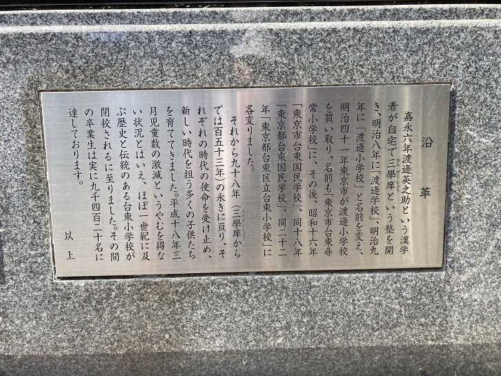 嘉永六年渡邊英之助という漢学者が自宅で三學庠という塾を開き、明治八年に「渡邊学校」、明治九年に「渡邊小学校」と名前を変え、明治四十一年東京市が渡邊小学校を買い取り、名前も「東京市台東尋常小学校」に、その後、昭和十六年「東京市台東国民学校」、同十八年「東京都台東国民学校」、同二十二年「東京都台東区立台東小学校」に各変りました。それから九十八年(三學庠からでは百五十三年)の永きに亘り、それぞれの時代の使命を受け止め、新しい時代を担う多くの子供たちを育ててきました。平成十八年三月児童数の激減というやむを得ない状況とはいえ、ほぼ一世紀に及ぶ歴史と伝統のある台東小学校が閉校されるに至りました。その間の卒業生は実に九千四百二十名に達しております。