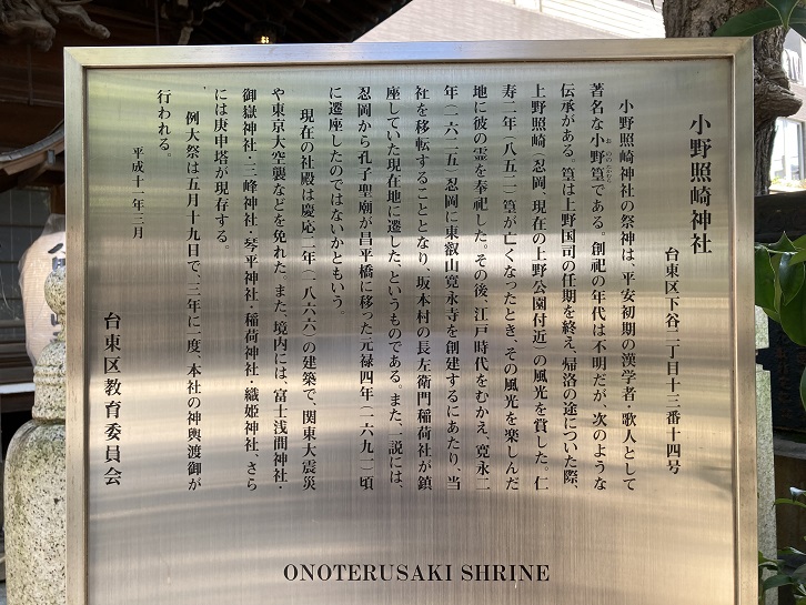 往昔、祭神御東下の砌(みぎり:時節・折り・頃)、上野照崎の地に御遺跡を留め給ひしを、地民渇望して上野殿と尊称し、後に照崎の地名をとりて小野照崎大明神を尊崇奉斎するを鎮座起源とす。其後社殿大破せしを、江戸太郎重長領主となるに及び、武運を祈りて再建し、星霜移り寛永年中、上野東叡山草創の砌坂本村長左衛門稲荷境内(境内地)に遷祀奉りし由緒正しき神社にして、現社殿は慶應三年の御造営にて、大正大震火災竝に大東亜戦争にも聊の被害も蒙る事無く、氏子十八ヶ町の産土神として御神経癒顕著也。御祭神小野篁命は敏達天皇の苗裔にして嵯峨天皇に仕へ、博学俊才を以て知られ、殊に詩歌に長じ、淳和天皇天長年中には令義解を選し、下野国の任を蒙りて足利に至るや我国学校の創始たる足利学校を創立、孔子像を祀り国人に書経を教ふ。亦百人一首の「わだの原八十島かけてこき出ぬと人には告げよあまのつり舟」の詠人としても知らる。御配神菅原道真命に就いては江戸二十五社大神の一つにして、渡会天満宮を伝承し菅原尊像を回向院より遷祀す。