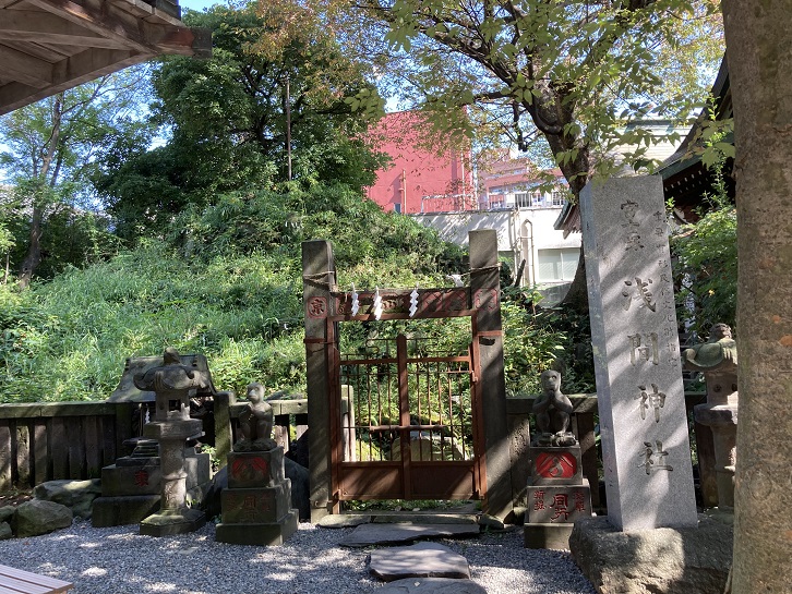 江戸時代から昭和にかけて、江戸の庶民を中心にして富士講が流行しました。富士講とは、富士山を神と見立てる民間信仰のことです。富士講の活動のひとつに富士山登山があります。しかし、当時の人たちにとって富士山まで旅をすることはとても大変でした。そこで、人びとは、富士山を訪れる代わりに、富士山を模した人工の山や塚である富士塚を参拝したのです。小野照崎神社の富士塚は、「下谷坂本富士」と呼ばれています。天明二年(1782年)に小野照崎神社に鎮座する浅間神社内に築山された高さ5メートル・幅16メートルの富士塚で、全体が富士山の溶岩石で覆われています。富士山の開山に合わせて年に2日だけ開放され、誰でも気軽に登ることができます。