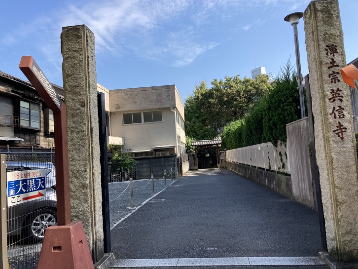 見所ポイントEの「英信寺」は、寛永八年(1631年)に雄誉霊巌によって開山されました。雄誉霊巌は江東区深川にある江戸六地蔵第五番が安置されている霊巌寺を創建したことでも知られています。開山当時は庵レベルの小堂で、「紫雲庵」と称していました。その頃、松平康信という丹波国の亀山藩の大名がいました。1656年に三男の松平英信が23才で亡くなり、その菩提を弔うために英信の姉の松平常子は彼の像を作り、紫雲庵に祀りました。そして、彼女は紫雲庵の名前を英信寺に変えました。これが英信寺の始まりです。