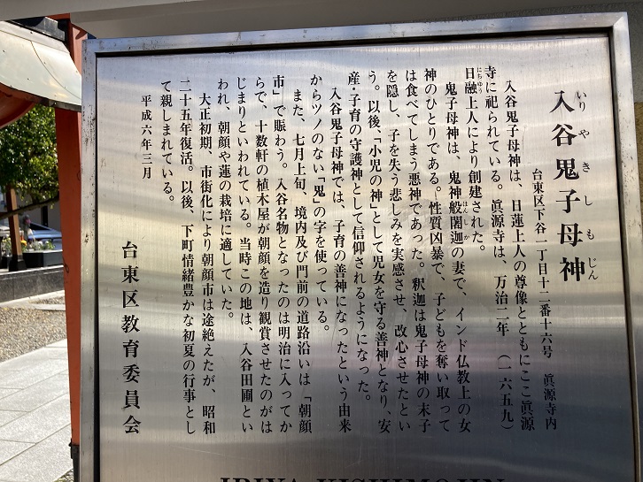 入谷鬼子母神は、日蓮上人の尊像とともにここ眞源寺に祀られている。眞源寺は、万治二年(1659年)日融上人により創建された。鬼子母神は、鬼神般闍迦の妻で、インド仏教上の女神のひとりである。性質凶暴で、子どもを奪い取っては食べてしまう悪神であった。釈迦は鬼子母神の末子を隠し、子を失う悲しみを実感させ、改心させたという。以後、「小児の神」として児女を守る善神となり、安産・子育の守護神として信仰されるようになった。入谷鬼子母神では、子育の善神になったという由来からツノのない「鬼」の字を使っている。また、七月上旬、境内及び門前の道路沿いは「朝顔市」で賑わう。入谷名物となったのは明治に入ってからで、十数軒の植木屋が朝顔を造り観賞させたのがはじまりといわれている。当時この地は、入谷田圃といわれ、朝顔や蓮の栽培に適していた。大正初期、市街化により朝顔市は途絶えたが、昭和二十五年復活。以後、下町情緒豊かな初夏の行事として親しまれている。