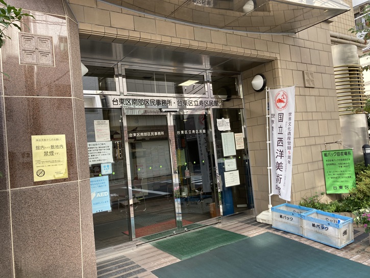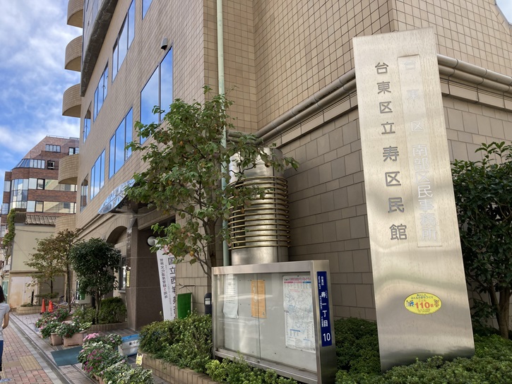 スタート地点の南部区民事務所から歩き始めます。台東区には西部・北部・南部の3ケ所の区民事務所があります。また、西部区民事務所には谷中分室、北部区民事務所には清川分室があります。この他、6ケ所の地区センターもあります。区民事務所とその分室では、殆どの証明書の発行、税金・保険料の納付、各種届出ができます。地区センターではこれらの業務は行なっていませんが、区民館の受付や町会との連絡・調整を行なっています。南部区民事務所の建物には寿区民館も入っています。区民館は、地域の人達の文化・創作活動やサークル活動など、自主的な活動を行なうための施設です。商店や企業の会議・研修にも利用できます。