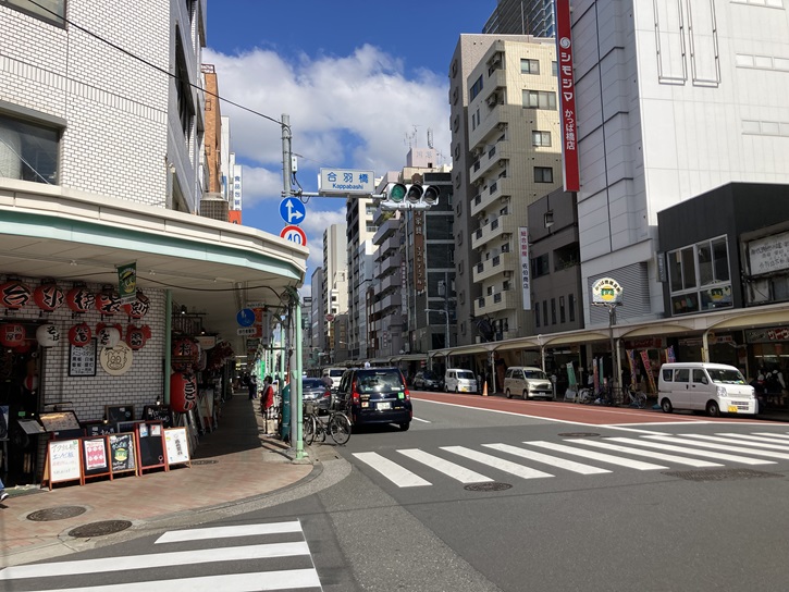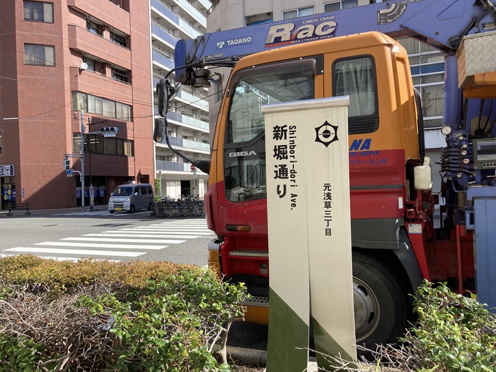南部区民事務所から新堀通りを北上します。「新堀通り」という通り名は、かって合羽橋道具街通りから新堀通りにかけて流れていた新堀川という掘割を暗渠にして、その上を道路にしたことに因んで名付けられました。