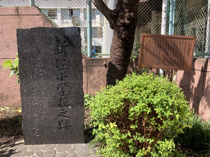 都立白鴎高等学校・附属中学校の外壁の前には、かって存在した学校の記念碑が建っています。新堀小学校は明治三十四年に開校しましたが、戦後間もなく廃校となりました。