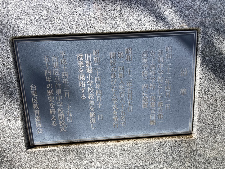 台東中学校は昭和二十二年4月に都立第一女子高等学校(現在の白鵬高校)の敷地内に開校し、二年後に廃校となった新堀小学校の校舎を修復して移転しました。その台東中学校も平成十四年に閉校し、跡地に都立白鴎高等学校の附属中学校が設置されることになったのです。長い歴史がありますね。