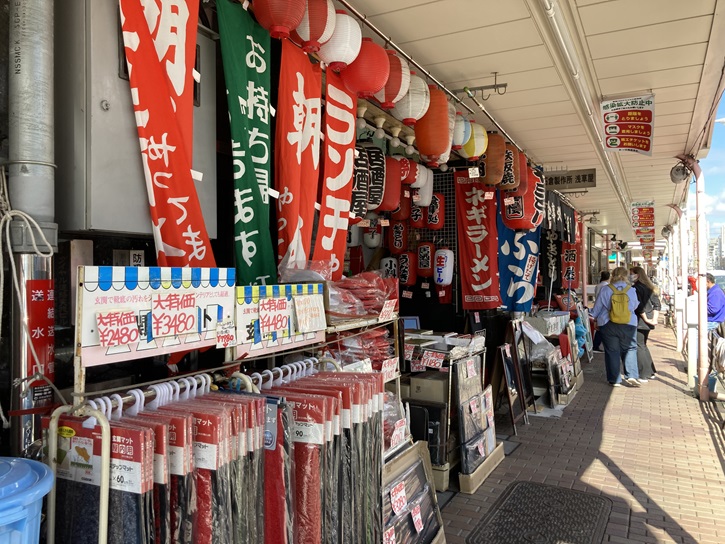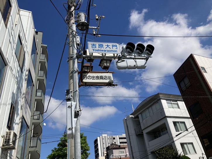 吉原大門交差点を渡り、日の出会商店街とアサヒ商店街を進みます。どちらも道路の両側に昭和レトロなお店が建ち並んでいます。