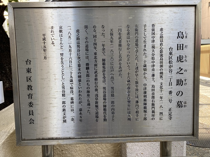 虎之助は直心影流島田派の剣客。文化十一年(1814年)に豊前国中津(現大分県中津市)藩士、島田市郎右衛門親房の子として生まれた。十歳頃から、中津藩剣術師範堀十郎左衛門の道場で学んだ。上達が早く数年後には、藩内で相手になる者はいなかったという。十六歳の春および翌年には九州一円を武者修行し名声をあげた。天保九年(1838年)に江戸へ出て、男谷精一郎の内弟子となった。一年余で、師範免許を受け、男谷道場の師範代を勤める。同十四年、東北方面に武者修行の後、浅草新堀で道場を開く。その道場には、勝麟太郎(のちの海舟)も通った。虎之助は男谷に次ぐ幕末の剣豪といわれたが、嘉永五年(1852年)九月十六日に三十九歳で病没。墓碑には、「余、哀歎ほとんど一臂を失うごとし」と男谷精一郎の銘文が刻まれている。