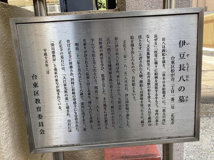 長八は鏝絵(こてえ)を描き、「異本日本絵類考」に、「最古の技に長ぜり」「柱等に種々に絵画を泥装するをもて、専門の業となし、又花瓶額面等に、花卉鳥獣の形を塗る、世人以て絶妙の技となす」と評された人物。鏝絵とは漆喰を塗った上に、鏝で絵を描き出したもので、石灰絵ともいう。文化十二年(1815年)八月五日、伊豆国松崎で誕生した。俗に伊豆長八と呼ばれ、世に知られた。天保元年(1830年)に江戸へ出て、左官棟梁源太郎の弟子となった。修行のかたわら、狩野派の画法を学び、乾道と号した。また晩年には仏教学も学んで天佑と号したという。明治三年(1870年)に名字の名乗りが許されると、最初上田と名乗り、後に入江と改姓した。明治二十二年十月八日に七十八歳で、深川に没すると、遺骨は正定寺に埋葬され、同時に松崎の浄感寺にも分骨された。正定寺の墓石には、「入江家先祖の墓」と刻まれ、台石には「深川播磨屋」と養家の家号が刻まれている。
