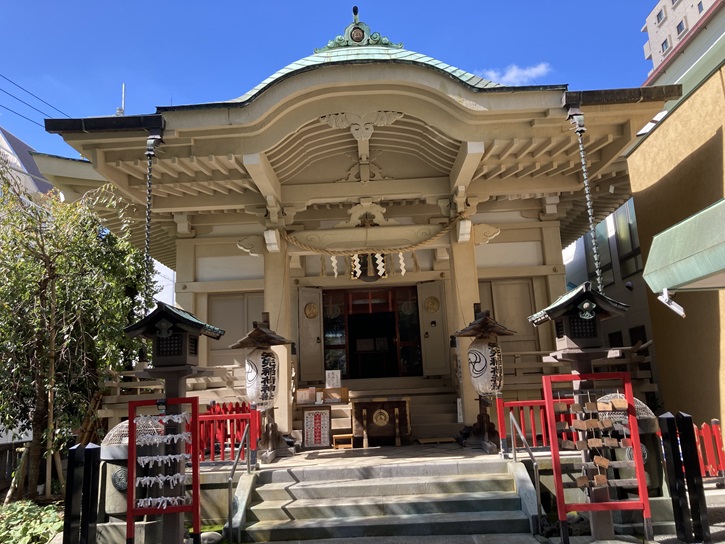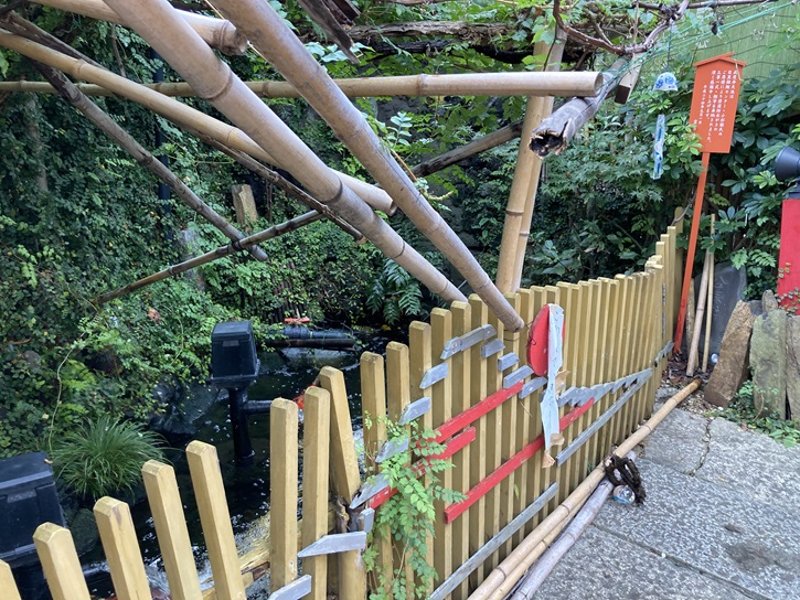 鳥居をくぐり奥へ進むと弁財天の御影が描かれた弁財天の社殿があります。拝所前に花園池(弁天池)の名残をとどめる小さな池があり、鯉や金魚も放たれています。