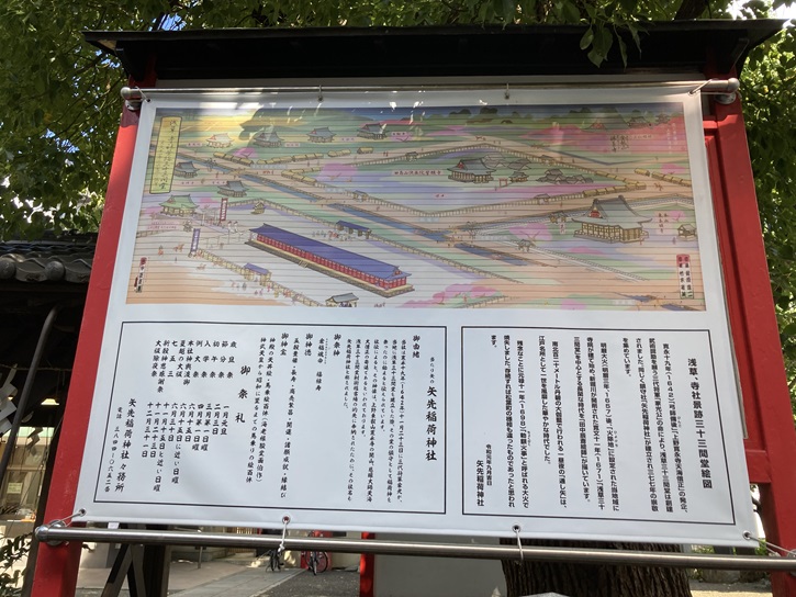 絵図の左下に浅草三十三間堂が描かれ、射術稽古場の的先(左端)に矢先稲荷神社の鳥居と本堂が位置しています。正に「矢先」ですね。