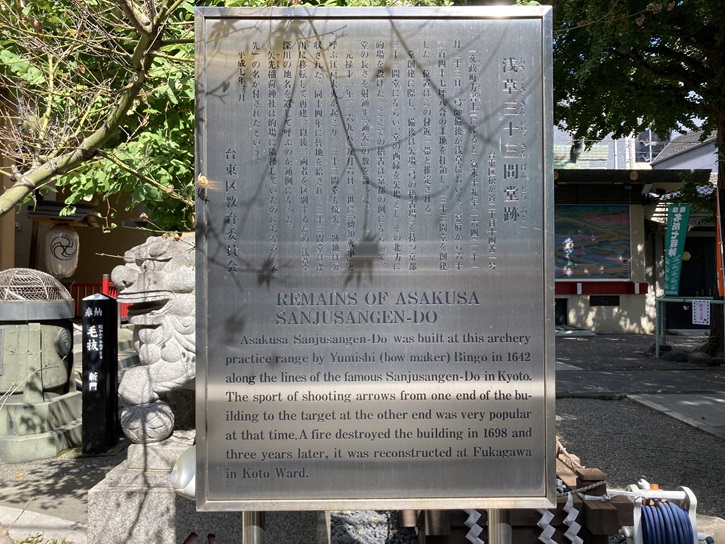 Asakusa Sanjusangen-Do was built at this archery practice range by Yumishi (bow maker) Bingo in 1642 along the lines of the famous Sanjusangen-Do in Kyoto. The sport of shooting arrows from one end of the building to the target at the other end was very popular at that time. A fire destroyed the building in 1698 and three years later, it was reconstructed at Fukagawa in Koto Ward.