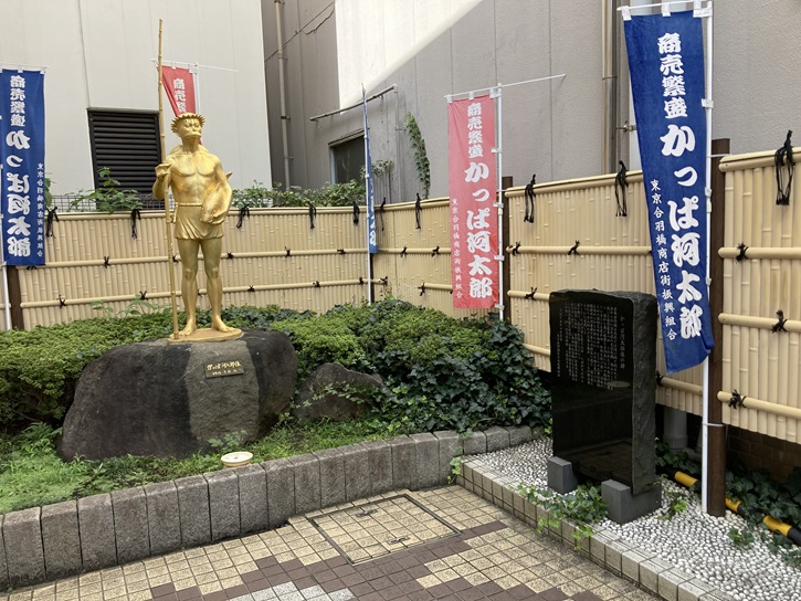 広場の奥には「かっぱ河太郎」の像が建っています。この像は、「合羽橋道具街」が誕生してから90年を迎えるにあたり、平成十五年10月にこれを記念して建立されたものです。「合羽橋道具街」は、明治末期から大正初期に古道具を取り扱う店の集まりから発生し、第二次世界大戦後に主に料理飲食店器具や菓子道具を販売する商店街へと発展しました。現在では、和・洋・中華食器、漆器・和洋菓子機器・厨房設備器具・ショーウインド・和洋家具・店舗装備デザイン施工・サンプル・看板・食料原材料・包装用品などを取り扱う170店舗余りから構成され、約800メートルにも連なる世界でも珍しい専門店街に成長しました。像を制作したのは、彫刻家の西村祐一氏と工芸作家の北村真一氏です。現在は暗渠となった道具街通りの下を流れる新堀川などの堀割工事を手伝ったとされる河童伝説に基づいて、道具街中央ポケットパーク再整備を契機に合羽橋商店街振興組合が主体となって像を建立しました。