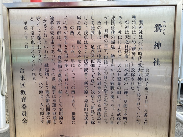 鷲神社は、江戸時代「鷲大明神社」と称されていたが、明治のはじめ「鷲神社」と改称された。祭神は天之日鷲命・日本武尊の二神。草創は不明である。社伝によれば、天之日鷲命の祠に、日本武尊が東国征伐の帰途、熊手をかけて戦勝を祝った。この日が十一月酉の日で、以後、この日をお祭と定めたという。酉の市は、江戸中期より冬の到来を告げる風物詩として発展し、足立区花畑を「大鳥」、浅草を「新鳥」と称した。浅草はとくに浅草観音・新吉原・猿若町芝居小屋を控え、賑いをみせた。一の酉、二の酉、年によって三の西とあり、世俗に三の酉があると火事が多いと言われる。酉の市は、当初、農産物や農具の一種として実用的な熊手を売る市であった。その後、熊手は幸運や財産を「かきこむ」といわれ、縁起物として商売繁昌開運の御守として尊ばれてきた。また、八ツ頭は、人の頭になる、子宝に恵まれるといわれる。