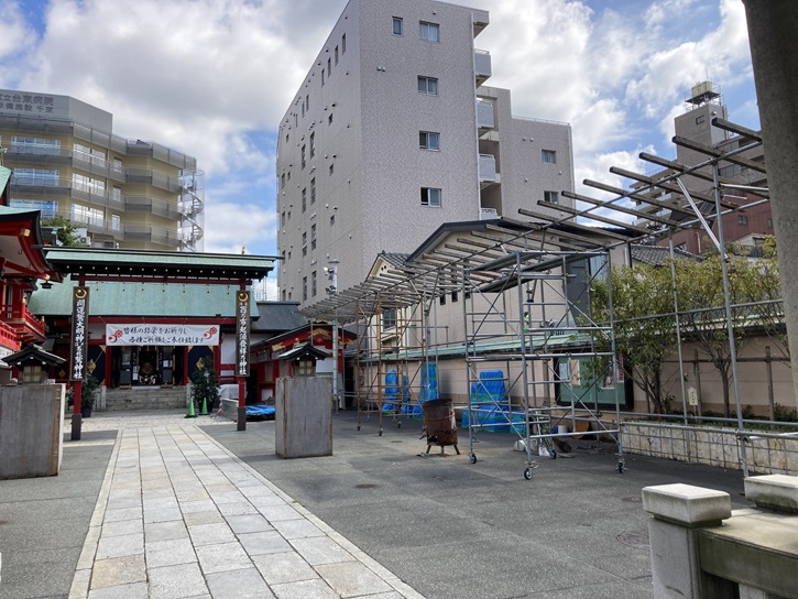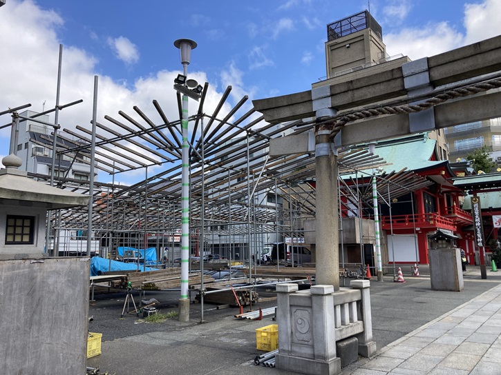 今日は10月の半ばですが、境内では早くも縁起物の熊手を売る露天の木組みが始まっています。