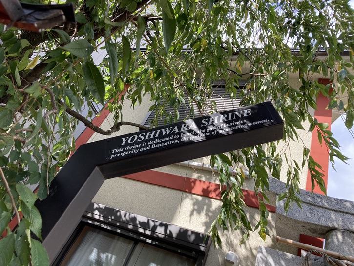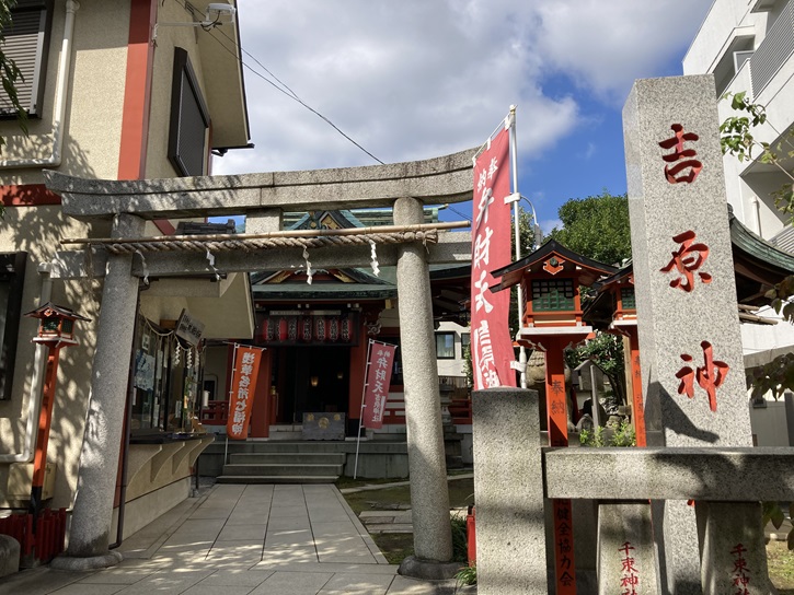 見所ポイントCの「吉原神社」は、明治五年(1872年)に新吉原遊郭の四隅に祀られていた開運稲荷大神・九郎助稲荷大神・榎本稲荷大神・明石稲荷大神と、往昔よりの玄徳稲荷社を合祀して創建されました。江戸時代から吉原廊はたびたび大火に遭いましたが、明治八年(1875年)の全焼後、吉原大門外の高札場の所に社殿が造営されました。その後も数回の火災に遭い、大正十二年(1923年)の関東大震災で焼失後、昭和九年(1935年)に新社殿を造営して現在地へ遷座しました。昭和二十年(1945年)の空襲で再び焼失し、昭和四十三年(1968年)に再建されたのが現社殿です。昭和十年(1935年)には吉原弁財天を合祀しています。