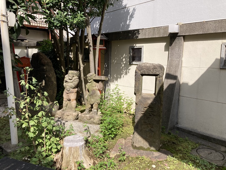 拝殿の向かって右に末社のような小さな社があります。説明書きには「お穴様」と書かれていて、なんでも神様は社の中ではなく地中にいらっしゃるのだとか。お穴様の横には、天燈鬼・龍燈鬼の石像が建っています。天燈鬼・龍燈鬼とは、四天王に踏みつけられる邪鬼を独立させ、仏前を照らす役目を与えられた鬼のことです。