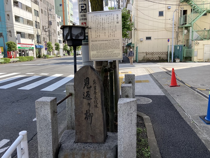 This is one of the memorial spots in the Yoshiwara licensed red-light district, a willow tree which is said to have been planted following another willow tree at the gate of Shimabara red-light district in Kyoto. This tree was called "Looking-back willow tree" because visitors returning home from the district looked back at
