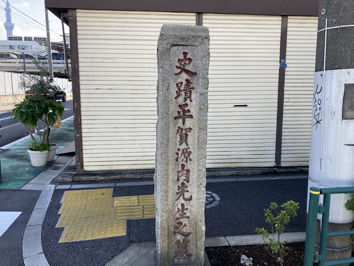 明治通りに面して、平賀源内の墓碑が建っています。平賀源内は江戸時代中頃の人物で、本草学者・地質学者・蘭学者・医者・殖産事業家・戯作者・浄瑠璃作者・俳人・蘭画家・発明家など、多彩な人物として知られています。発明家としての業績には、オランダ製の静電気発生装置エレキテルの紹介や火浣布(石綿を布にしたもの)の開発があります。また、土用の丑の日にウナギを食べる風習は源内が発祥との説があります。商売がうまくいかない鰻屋(源内の知り合いの鰻屋という説もあります)が、夏に売れない鰻を何とか売るため源内の元に相談に赴きました。源内は、「本日丑の日」と書いて店先に貼ることを勧めました。すると、その鰻屋は大変繁盛しました。その後、他の鰻屋もそれを真似るようになり、土用の丑の日に鰻を食べる風習が定着したというものです。