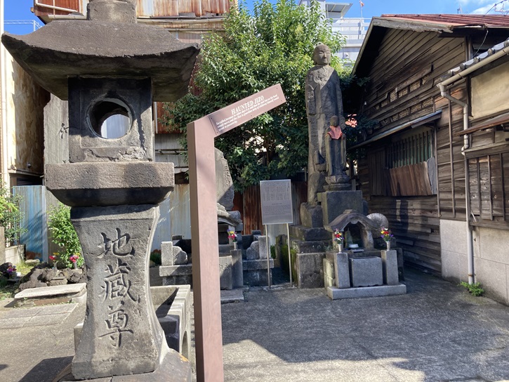 「お化け地蔵」の名には、かつて大きな笠をかぶり、その笠が向きをかえたから、あるいは高さ三メートル余の並はずれて大きいからなど、いくつかの伝承がある。この辺りは、室町時代以来、禅宗の名刹総泉寺の境内地であった。門前一帯を浅茅ヶ原といい、明治四十年刊「東京名所図会」には「浅茅ヶ原の松並木の道の傍らに大いなる石地蔵ありしを維新の際並木の松を伐りとり、石地蔵は総泉寺入口に移したり」とあり、「当寺入口に常夜灯あり、東畔に大地蔵安置す」とも記している。お化け地蔵の台石によれば、この石仏は享保六年(1721年)の建立。関東大震災で二つに折れたが、補修し現在にいたっており頭部も取りかえられている。常夜灯は、寛政二年(1790年)に建てられた。総泉寺は、昭和四年板橋区へ移転した。「お化け地蔵」近くにある「元総泉寺境内諸仏供養の為」の碑は移転に際し建てられたものと思われる。