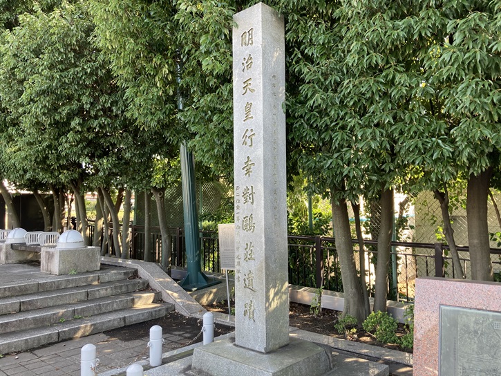 隅田川畔の橋場一帯は、風光明眉な地であり、かつては著名人の屋敷が軒を連ねていたという。対鴎荘もそのひとつで、明治時代の政治家三条実美(一八三七年〜一八九一年)の別邸であった。「征韓論」をめぐって、政府内に対立が続いていた明治六年(一八七三年)の十月、太政大臣の要職にあった実美は心労のあまり病に倒れ、この別邸で静養していたが、同年十二月十九日明治天皇は病床の実美を気遣い、この邸を訪れている。隣の碑は、この事跡を顕彰して、のち対鴎荘の所有者となった一市民の尽力によって建立されたものである。高さ三メートル余。側面に「昭和六年歳次辛末五月建之石井久太郎」、裏面に「多摩聖蹟記念館顧問中島利一郎謹撰 上条修徳謹書」の碑文が刻まれている。対鴎荘は、昭和三年(一九二八年)、白鬚橋架橋工事に伴い、多摩聖蹟記念館(多摩市連光寺)に移築された。