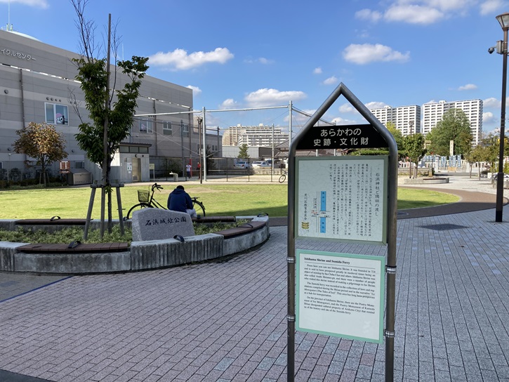 From here you can see Ishihama Shrine. It was founded in 724 and is said to have prospered greatly in medieval times being an object of worship by the Chiba Clan and others. Ishihama Shrine was also called Asahi Shinmei-gu, and there were a number of people who visited this shrine instead of making a pilgrimage to Ise Shrine. The Sumida ferry was recorded in the collection of laws and regulations compiled during the Heian period and in the narrative "Ise Monogatari (The Tales of Ise)". This area has long been prosperous as a hub for transportation. On the precinct of Ishihama Shrine, there are the Poetry Monument of Ise Monogatari, and the Poetry Monument of Kameda Hosai (designated cultural property of Arakawa City) that remind us of the history and site of the Sumida ferry.