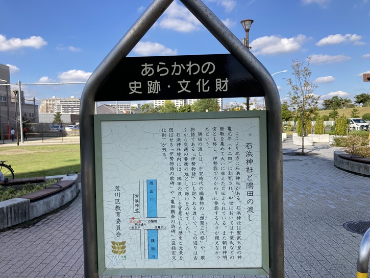 ここより北方に石浜神社がある。石浜神社は聖武天皇の神亀元年(724年)に創祀され、中世においては千葉氏などの崇敬を集めて大いに栄えたと伝えられている。また朝日神明宮とも称し、伊勢詣でのかわりに参詣する人々が絶えなかったという。隅田の渡しは、平安時代の編纂物の「類聚三代格」や、歌物語である「伊勢物語」にも記される渡しで、この辺りは古くから交通の要衝の地として賑いをみせていた。石浜神社境内には、隅田の渡しを背景にした歴史と光景を偲ばせる「伊勢物語の歌碑」や「亀田鵬斎の詩碑」(区指定文化財)が残る。
