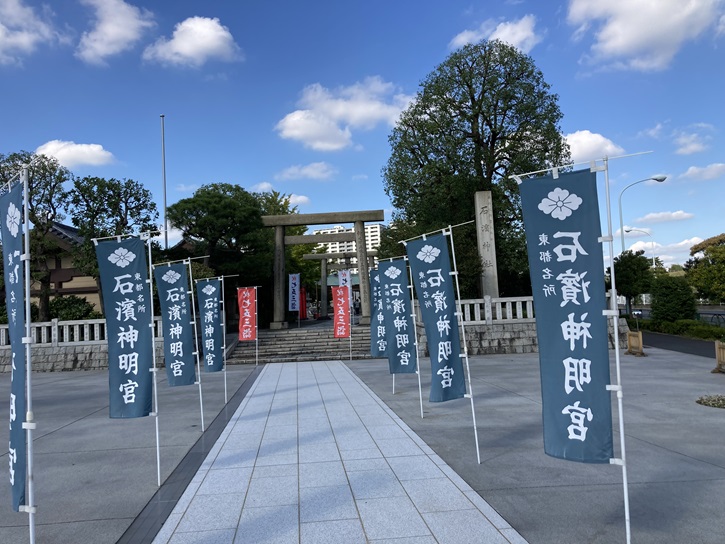 石浜神社は神亀元年(724年)に創建され、隅田川の西岸(石浜と呼ばれた長く伸びる微高地)に鎮座しています。源頼朝が奥州征討の折に戦勝を祈願し、また元寇の際には朝廷から鎌倉幕府七代将軍・惟康親王を勅使として戦勝を祈願させました。いずれの戦役にも勝利したことから、中世以降は関東武士を始め多くの人々の崇敬を集めることになりました。この地域には中世の鎌倉・南北朝時代から安土桃山時代頃にかけて石浜城が存在し、石浜神社付近が城跡候補地のひとつとされていて、東京都の遺跡地図上では石浜神社北側が埋蔵文化財包蔵地となっています。