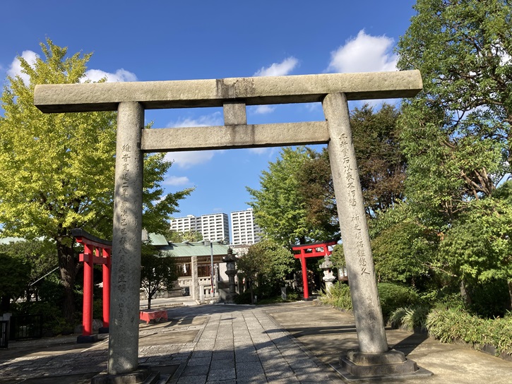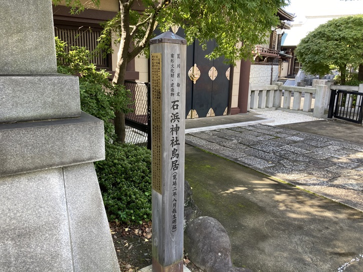 石浜神社は、少し変則的な鳥居(笠木の断面がカマボコ型の神明鳥居)がある事で知られています。第一鳥居は1780年に建立され、荒川区の登録有形文化財になっています。笠木(一番上の横棒)の断面がカマボコ型の靖国鳥居になっていて、おそらく全国でも石浜神社だけで、石浜鳥居と俗称されています。749年建立の第二鳥居も荒川区登録有形文化財になっていて、第一鳥居と同じく、笠木の断面がカマボコ型の石浜鳥居です。