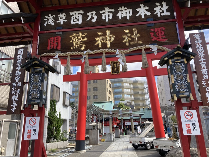 鷲神社は、江戸時代「鷲大明神社」と称されていたが、明治のはじめ「鷲神社」と改称された。祭神は天之日鷲命・日本武尊の二神。草創は不明である。社伝によれば、天之日鷲命の祠に、日本武尊が東国征伐の帰途、熊手をかけて戦勝を祝った。この日が十一月酉の日で、以後、この日をお祭と定めたという。酉の市は、江戸中期より冬の到来を告げる風物詩として発展し、足立区花畑を「大鳥」、浅草を「新鳥」と称した。浅草はとくに浅草観音・新吉原・猿若町芝居小屋を控え、賑いをみせた。一の酉、二の酉、年によって三の西とあり、世俗に三の酉があると火事が多いと言われる。酉の市は、当初、農産物や農具の一種として実用的な熊手を売る市であった。その後、熊手は幸運や財産を「かきこむ」といわれ、縁起物として商売繁昌開運の御守として尊ばれてきた。また、八ツ頭は、人の頭になる、子宝に恵まれるといわれる。