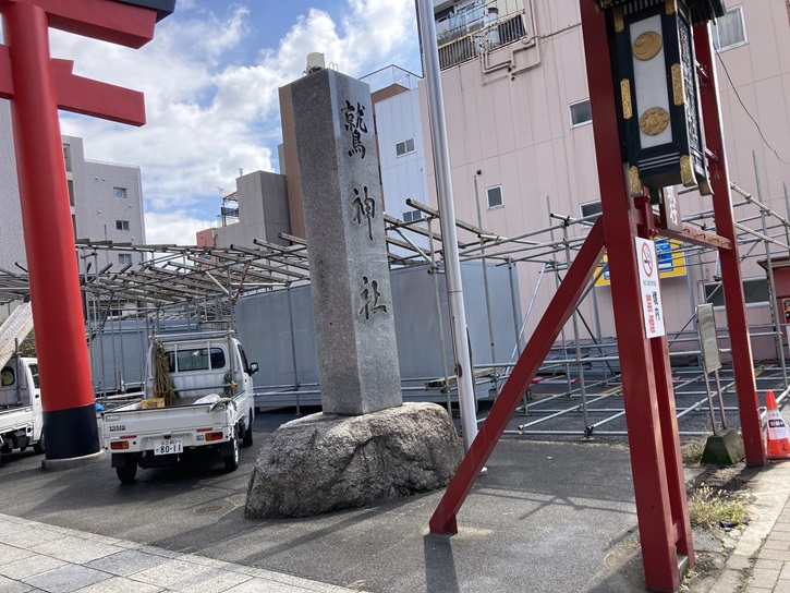 今日は10月の下旬ですが、境内では早くも縁起物の熊手を売る露天の木組みが始まっています。