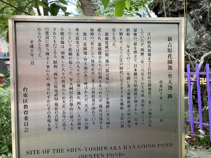 江戸時代初期までこの附近は湿地帯で、多くの池が点在していたが、明暦三年(1657年)の大火後、幕府の命により、湿地の一部を埋立て、日本橋の吉原遊郭が移された。以来、昭和三十三年までの300年間に及ぶ遊郭街新吉原の歴史が始まり、とくに江戸時代にはさまざまな風俗・文化の源泉となった。遊郭造成の際、池の一部は残り、いつしか池畔に弁天祠が祀られ、遊郭楼主たちの信仰をあつめたが、現在は浅草七福神の一社として、毎年正月に多くの参拝者が訪れている。池は花園池・弁天池の名で呼ばれたが、大正十二年の関東大震災では多くの人々がこの池に逃れ、490人が溺死したという悲劇が起こった。弁天祠附近の築山に建つ大きな観音様は、溺死した人々の供養のため大正十五年に造立されたものである。昭和三十四年吉原電話局(現在の吉原ビル)の建設に伴う埋立工事のため、池はわずかにその名残を留めるのみとなった。