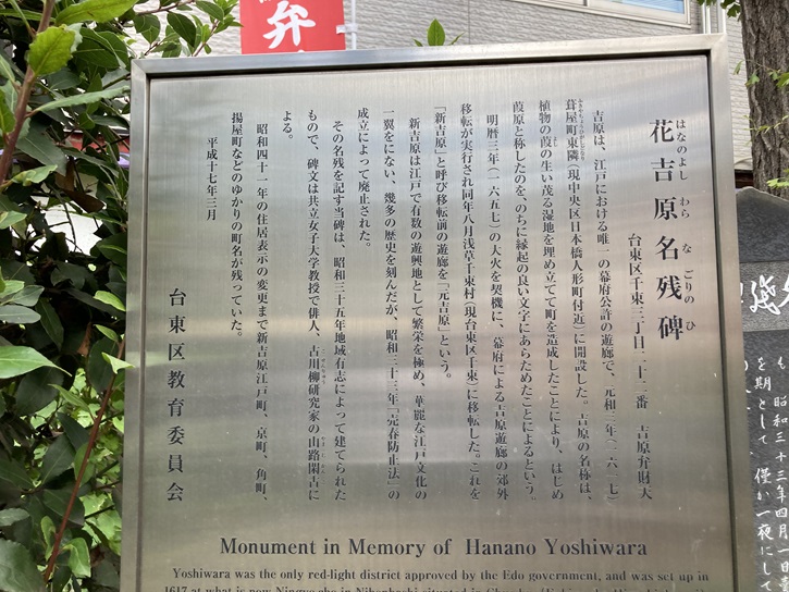 Yoshiwara was the only red-light district approved by the Edo government, and was set up in 1617 at what is now Ningyo-cho in Nihonbashi situated in Chuo-ku (Fukiya-cho Higashi-donari). The name of Yoshiwara is said to originate from the fact that the town was created by reclaiming a marsh area where ditch reed (Yoshi) grew in abundance. The government executed the order to move the Yoshiwara red-light district to a suburban area due to the disastrous fire in 1657, and Yoshiwara was moved to the location of present-day Senzoku in Taito-ku (Senzoku-mura in Asakusa) in August of the same year. The Yoshiwara in the new location was called "Shin-yoshiwara" as opposed to "Moto-yoshiwara", the original red-light district. Shin-yoshiwara was extremely prosperous as one of the greatest entertainment district in Edo. became a part of the splendid Edo culture, and was the scene of many historical events, before it was abolished in 1958 with the establishment of the Anti-Prostitution Act. This monument in memory of Shin-yoshiwara was set up by local volunteers in 1960. The epitaph is written by Yamaji Kanko, a haiku poet, a researcher of the old senryu (old satirical seventeen-syllable poems), and a professor at Kyoritsu Women's Education Institution. Until the residence indication was changed in 1966, various town names that were related to Yoshiwara, such as Shin-yoshiwara Edo-cho, Kyo-machi, Sumi-cho and Ageya-cho, remained.