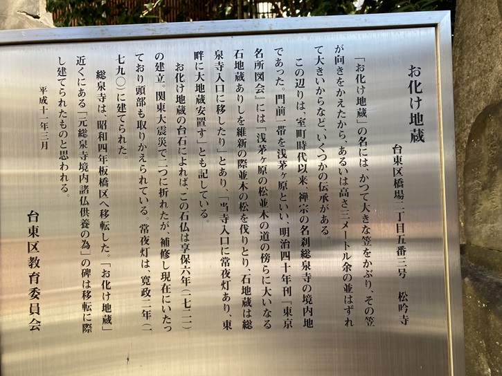 「お化け地蔵」の名には、かつて大きな笠をかぶり、その笠が向きをかえたから、あるいは高さ三メートル余の並はずれて大きいからなど、いくつかの伝承がある。この辺りは、室町時代以来、禅宗の名刹総泉寺の境内地であった。門前一帯を浅茅ヶ原といい、明治四十年刊「東京名所図会」には「浅茅ヶ原の松並木の道の傍らに大いなる石地蔵ありしを維新の際並木の松を伐りとり、石地蔵は総泉寺入口に移したり」とあり、「当寺入口に常夜灯あり、東畔に大地蔵安置す」とも記している。お化け地蔵の台石によれば、この石仏は享保六年(1721年)の建立。関東大震災で二つに折れたが、補修し現在にいたっており頭部も取りかえられている。常夜灯は、寛政二年(1790年)に建てられた。総泉寺は、昭和四年板橋区へ移転した。「お化け地蔵」近くにある「元総泉寺境内諸仏供養の為」の碑は移転に際し建てられたものと思われる。
