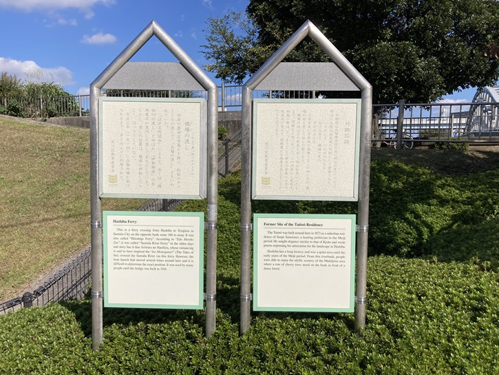 The Taioso was built around here in 1873 as a suburban residence of Sanjo Sanetomi, a leading politician in the Meiji period. He sought elegance similar to that of Kyoto and wrote poems expressing his admiration for the landscape in Hashiba. Hashiba has a long history and was a quiet area until the early years of the Meiji period. From this riverbank, people were able to enjoy the idyllic scenery of the Mukojima area where a row of cherry trees stood on the bank in front of a dense forest.