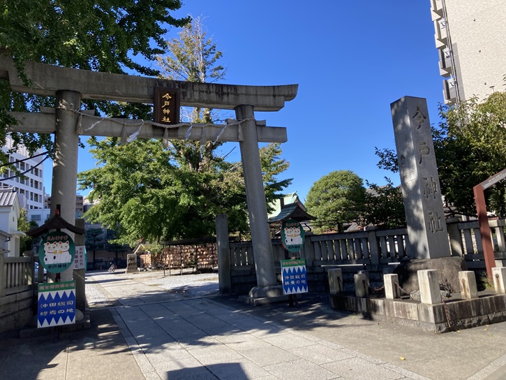 橋場通りを南下して見所ポイントFの「今戸神社」に向かいます。今戸神社は、康平六年(1063年)、源頼義・義家親子が奥州討伐の折、京都の石清水八幡宮を当地に勧進し、祈願したのが始まりであるといわれています。また永保元年(1081年)にも清原武衡・家衡討伐の際に当地を通り、戦勝祈願をしたといわれています。大正十二年(1923年)9月1日の関東大震災や太平洋戦争の際、米軍の爆撃機B−29が昭和二十年(1945年)3月10日に焼夷弾を投下(東京大空襲)など数々の戦乱や火災に見舞われましたが、その都度再建され、現在の社殿は昭和四十六年(1971年)に再建されました。昭和十二年(1937年)には隣接していた白山神社を合祀し、今戸八幡という名称から現在の今戸神社と呼ばれるようになりました。今戸神社は浅草七福神のひとつである福禄寿も祀っています。鳥居の前には、一対の縁結びの「招き猫」の看板が掛けられています。伝記によりますと、浅草花川戸に住んでいた老婆が貧しさゆえに愛猫を手放しましたが、夢枕にその猫が現れ、「自分の姿を人形にしたら福徳を授かる」と言ったので、その猫の姿の人形を今戸焼の焼き物にして浅草寺境内三社権現(現浅草神社【三社様】)鳥居横で売ったところ、たちまち評判になったということです。戦前合祀された白山神社の祭神である伊弉諾尊・伊弉冉尊の夫婦の神を祀っていることから、縁結びに御利益があるとされています。看板の下には、「沖田総司の終焉の地」と書かれています。今戸神社は、新選組の有力メンバーであった沖田総司終焉の地として、境内に石碑が建っています。但し、招き猫の伝説も沖田総司終焉の地の根拠も定かではありません。