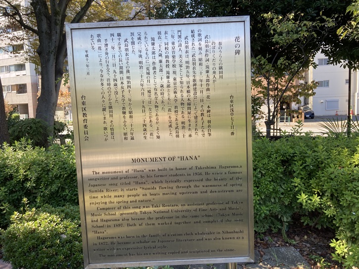 The monument of "Hana" was built in honor of Takeshima Hagoromo, a songwriter and professor, by his former students in 1956. He wrote a famous Japanese song titled "Hana", which lyrically expressed the beauty of the Sumida River; it starts "Sumida flowing through the warmness of spring time while many people on boats moving upstream and downstream are enjoying the spring and nature." Composer of this song was Taki Rentaro, an assistant professor of Tokyo Music School (presently Tokyo National University of Fine Arts and Music), and Hagoromo also became the professor in the same school (Tokyo Music School) in 1897. Both of them worked together and completed the song "Hana". Hagoromo was born in the family of a cotton cloth wholesaler in ihonbashi